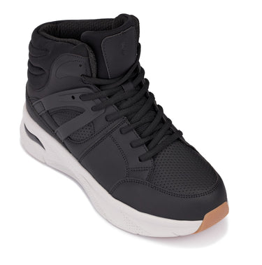 - Style: Premium high-top basketball sneaker with sleek synthetic upper, perforated mesh ventilation, and secure lace-up closure for modern height-boosting footwear.